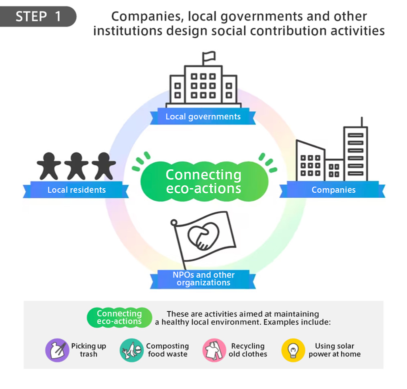 It starts with the design of social contribution activities undertaken by companies and local governments. It is not limited to specific actions, but covers everyday social contribution activities such as cleaning, recycling, saving electricity, and choosing the best means of transportation.