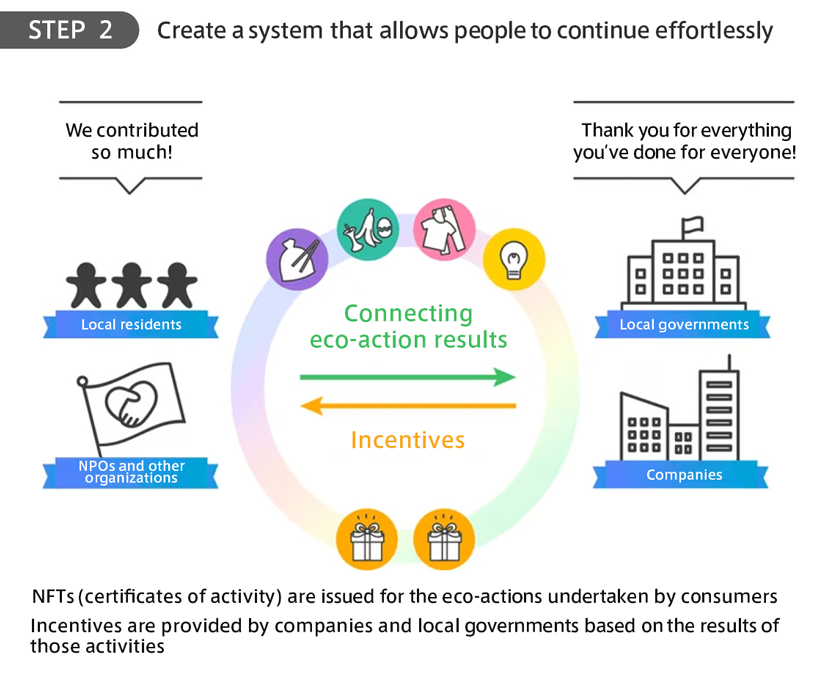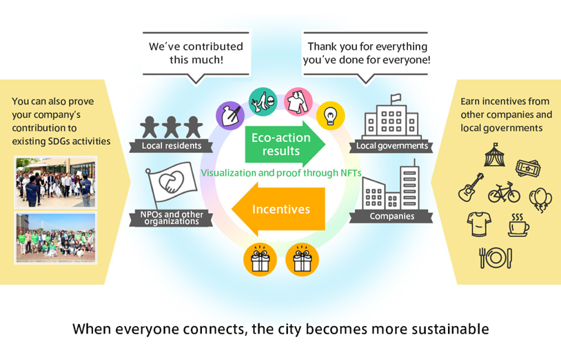 Ultimately, the contribution to society (such as CO2 reductions and number of activity participants) of all of the activities undertaken through Tsunaga LOOOP, as well as that of individual companies, local governments, and consumers, can be recorded in NFTs and visualized as data. This transparency creates new trust, encourages further participation, and creates a virtuous cycle of social contribution.