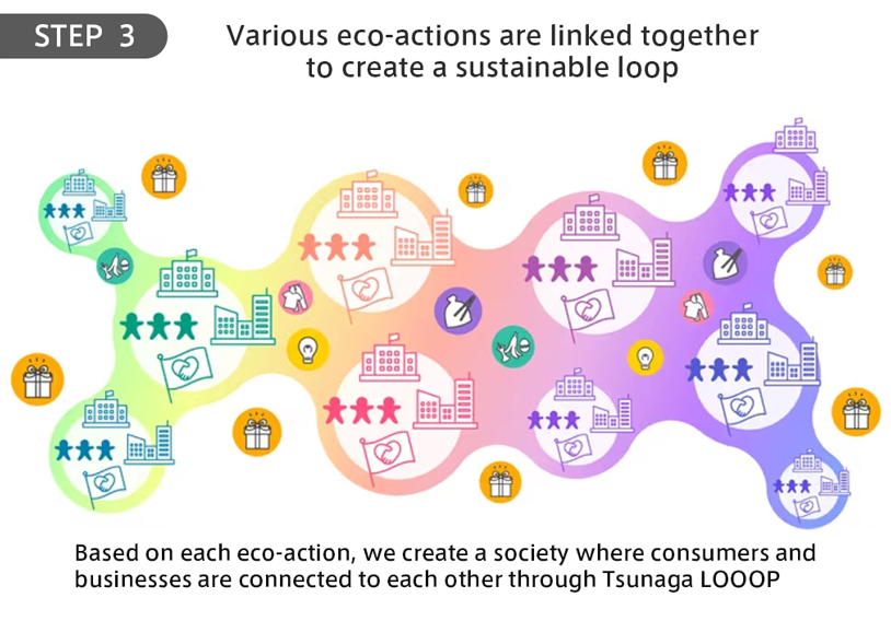 The goal of Tsunaga LOOOP is to realize social contribution activities that are effortless, fun, and allow people to participate on an ongoing basis. First, we will explain in four steps how companies, local governments, and consumers can get involved in social contribution activities using the Tsunaga LOOOP system.