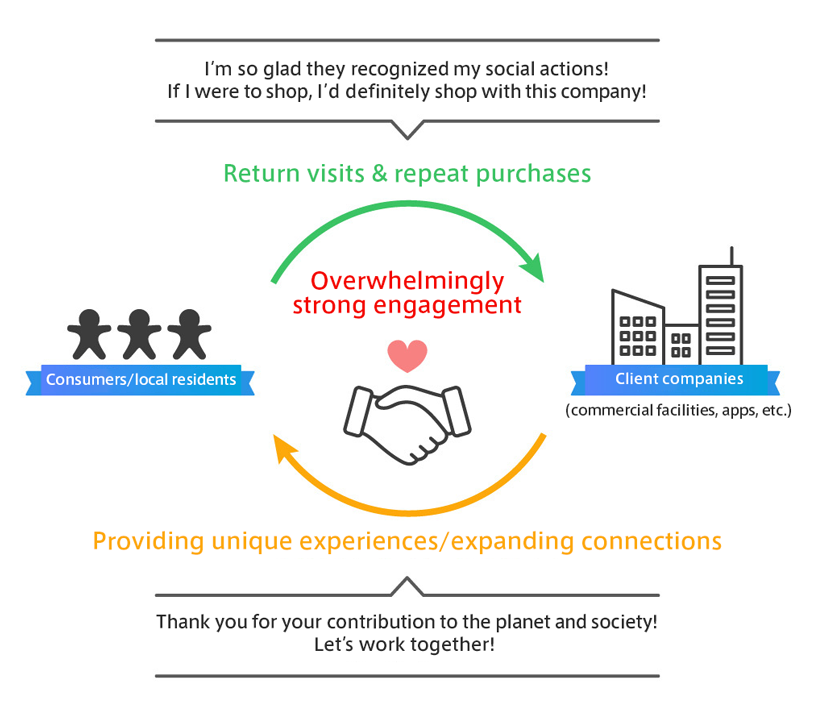 By praising and supporting the social contribution made by consumers, companies can build stronger relationships than ever before. Rather than building relationships with customers through monetary value, we believe that the experience of “doing something good for society and then having my favorite brand recognize it” has great value in creating strong engagement.