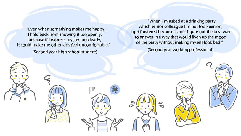Speaking one’s true thoughts in inter-personal relationships sometimes runs the risk of making others uncomfortable, disrupting the atmosphere, or exhausting oneself. Young people today prioritize avoidance of such risks above all else; they choose not to articulate their true thoughts and avoid pressing others about theirs, seeking to ensure that neither they nor others become emotionally drained.