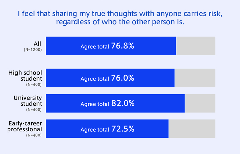 “I feel that sharing my true thoughts with anyone carries risk, regardless of who the other person is.” In this survey, 76.8% of all young people responded in this way. When people talk in this way they are referring not only to workplace managers and senior staff, but also to close friends and colleagues. For young people, speaking one’s true thoughts has become an “action requiring careful handling,” regardless of the closeness of the relationship.
