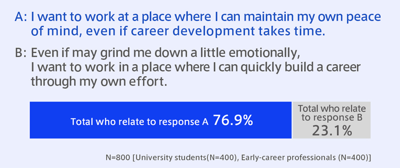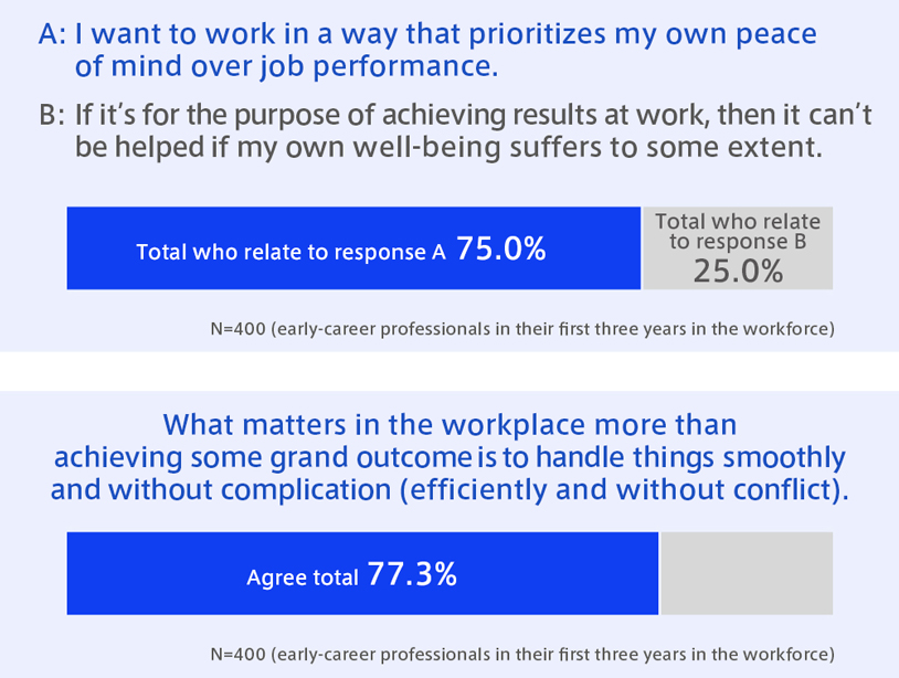 In our survey, 75.0% of early-career professionals responded that “ I want to work in a way that prioritizes my own peace of mind over job performance.” Furthermore, 77.3% answered that they consider “What matters in the workplace more than achieving some grand outcome is to handle things smoothly and without complication.” This suggests that in personal career development, what is being given first priority as a standard is to “not let one’s own well-being suffer.”