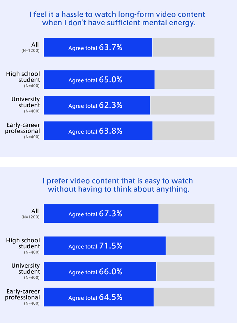 A total of 63.7% of young people surveyed responded that “I feel it a hassle to watch long-form video content when I don’t have sufficient mental energy.” 67.3% responded that “I prefer video content that is easy to watch without having to think about anything.” These responses are suggestive of an unconscious desire to choose things that require no thought, and in so doing avoid emotional contamination as much as possible.