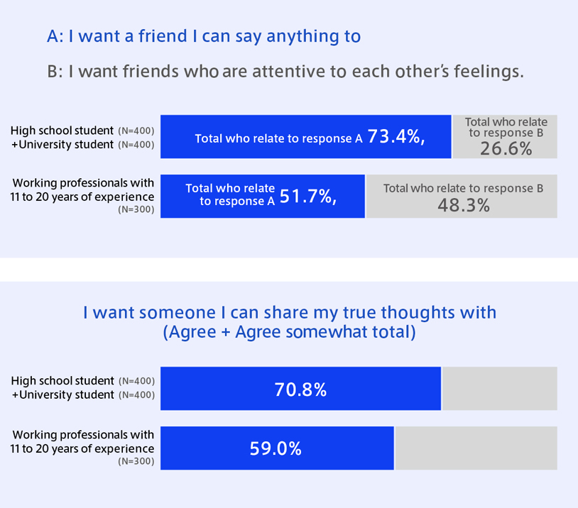 Statements like “I want a friend I can say anything to” or “I want someone I can share my true thoughts with” showed higher scores among young people compared to older adults. While young people may have become accustomed to holding back from sharing their true feelings, this is not necessarily what they desire. Rather, they appear to quietly harbor a sense of loneliness regarding the difficulty of creating relationships where they can be truly themselves, along with a yearning for a future where such relationships can be built.