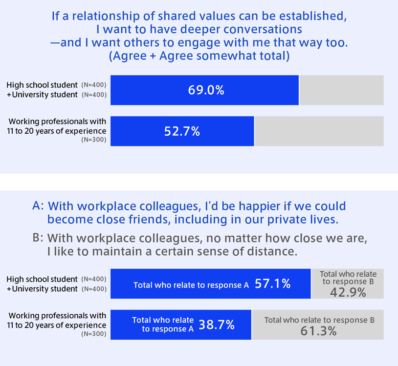If good interpersonal relationships can be built, young people seem to want more meaningful conversations with their managers and senior colleagues. Many also hope for relationships where they become close even in their private lives. Precisely because keeping their distance is set as the baseline, meaningful exchanges of true feelings carry special value.