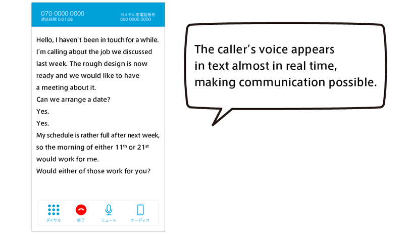 Uemura: Although some people may not feel unduly inconvenienced in their daily lives, they may experience difficulty hearing the more mechanized sounds of a phone. Such people can use Yometel to check the text just for the parts they couldn’t hear very well.