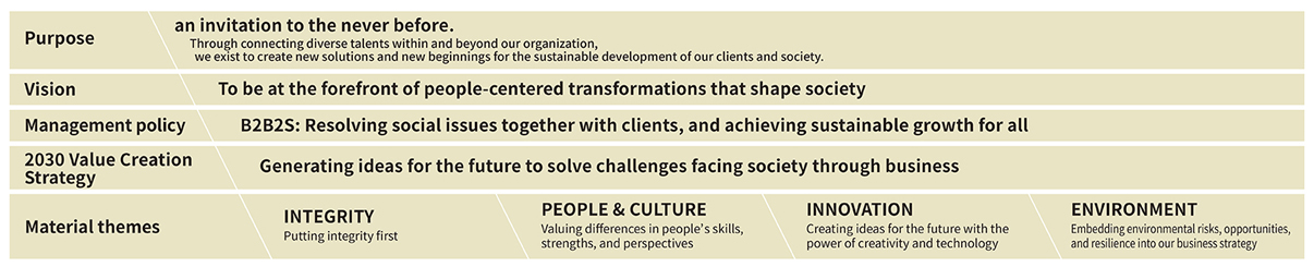 For dentsu Group, sustainability is a prerequisite for realizing our purpose, "an invitation to the never before." Our strategy to promote sustainability is our value creation strategy. In 2025, with the aim of building a more robust management foundation in response to changing social conditions, we revised our 2030 Sustainability Strategy to the 2030 Value Creation Strategy. This strategy is all about generating ideas for the future to solve challenges facing society through business.