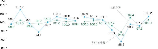 (2)日本の総広告費と国内総生産(GDP)の推移