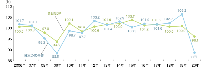(2)日本の総広告費と名目国内総生産(GDP)の推移