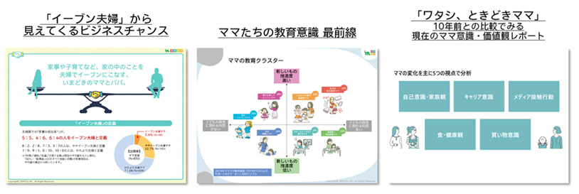 「コロナ禍に立ち向かうママ達の意識調査」、「令和時代の育児のリアル」、「イマドキママのスマホアプリ利用実態調査」、「ママのデジタルメディア利用研究」、「大人ママプロジェクト」等