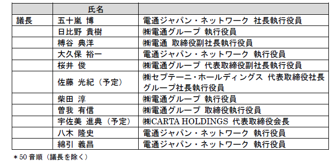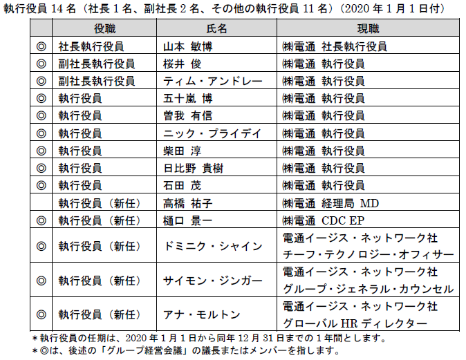 株式会社電通グループの取締役会およびグループ経営会議からの委譲を受け、取締役会およびグループ経営会議決議事項以外の株式会社電通グループのジャパン・ネットワークに関する重要事項の審議、ジャパン・ネットワーク経営上の課題の認識、ジャパン・ネットワークの経営計画を策定する会議体として「電通ジャパン・ネットワーク・ボード」を設置します。議長は五十嵐 電通ジャパン・ネットワークCEOが務め、メンバーは以下のとおり(追加選任の可能性有)とします。その任期は、2020年1月1日から同年12月31日までの1年間とします。