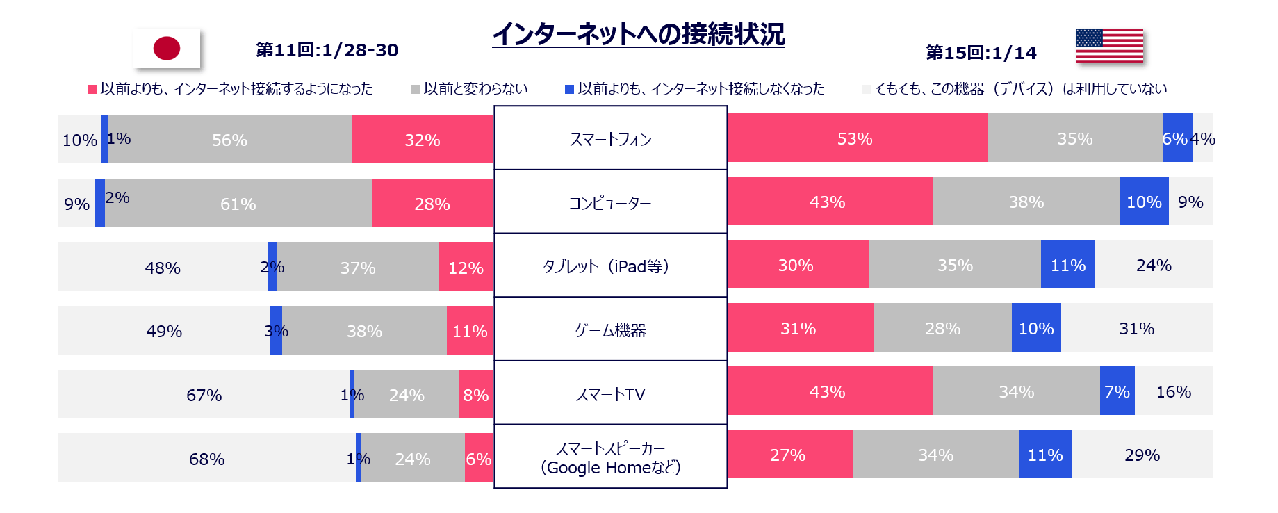 ・「スマートTV」「スマートスピーカー」などのデバイスは、米国の方が普及が進んでおりそれらのネット接続が増えた人も増加。