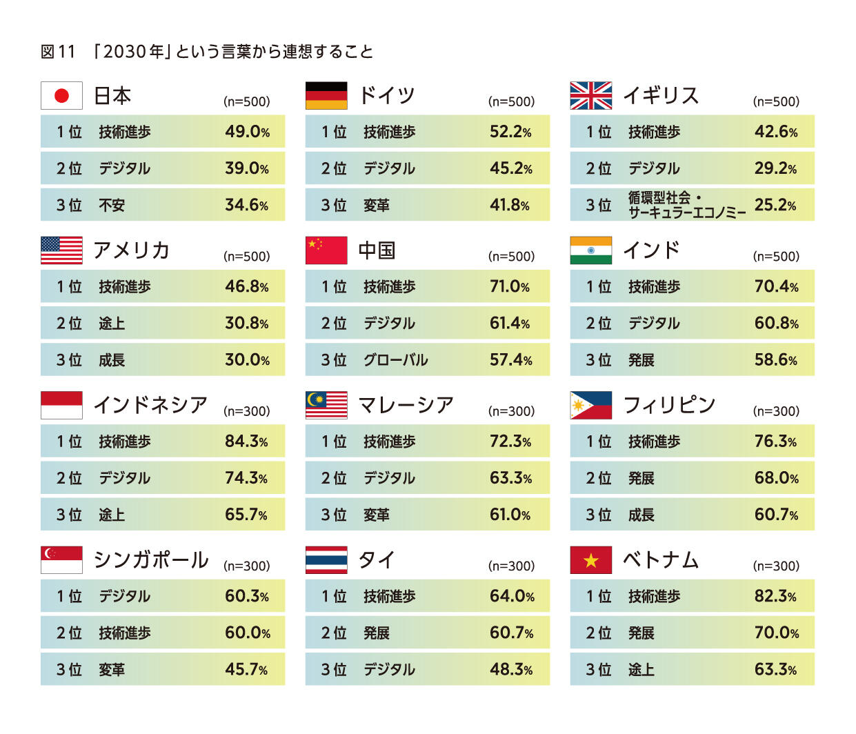 ・「デジタル」「技術進歩」「発展」「グローバル」が国を問わず上位。