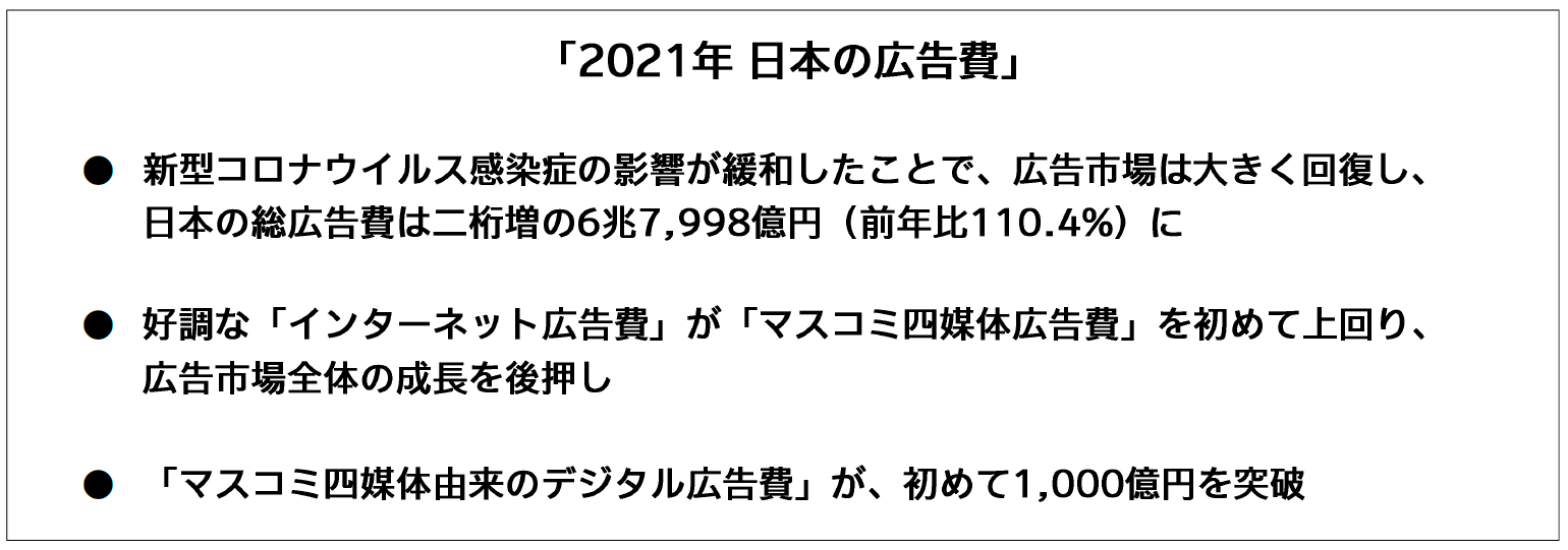 コロナ禍からの市況の回復により、「新聞広告費」「雑誌広告費」「ラジオ広告費」「テレビメディア広告費」のすべてが増加した。特に「テレビメディア広告費」においては、巣ごもり・在宅需要なども影響し、前年比で二桁増となった。