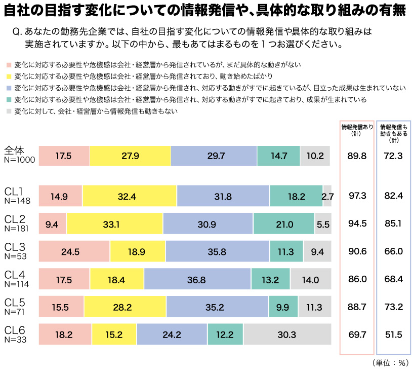 ① 自社が目指す変化についての情報発信や具体的な取り組みの有無を聞いたところ、全体では、何らかの情報発信や動きがあると回答した従業員は7割以上で、情報発信だけに絞ると、9割近い結果となった。