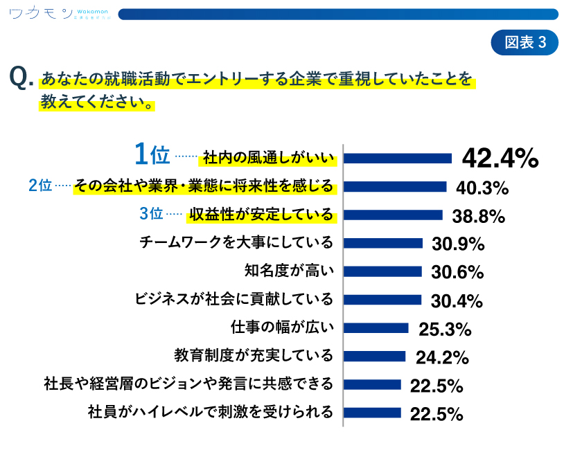 ② 企業選びで最も重視するのは、「社内の風通しの良さ」(42.4%)。Z世代就活生は、企業の「社風」を重視する傾向がある。