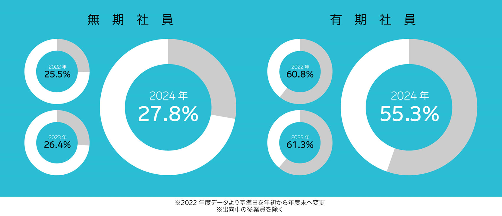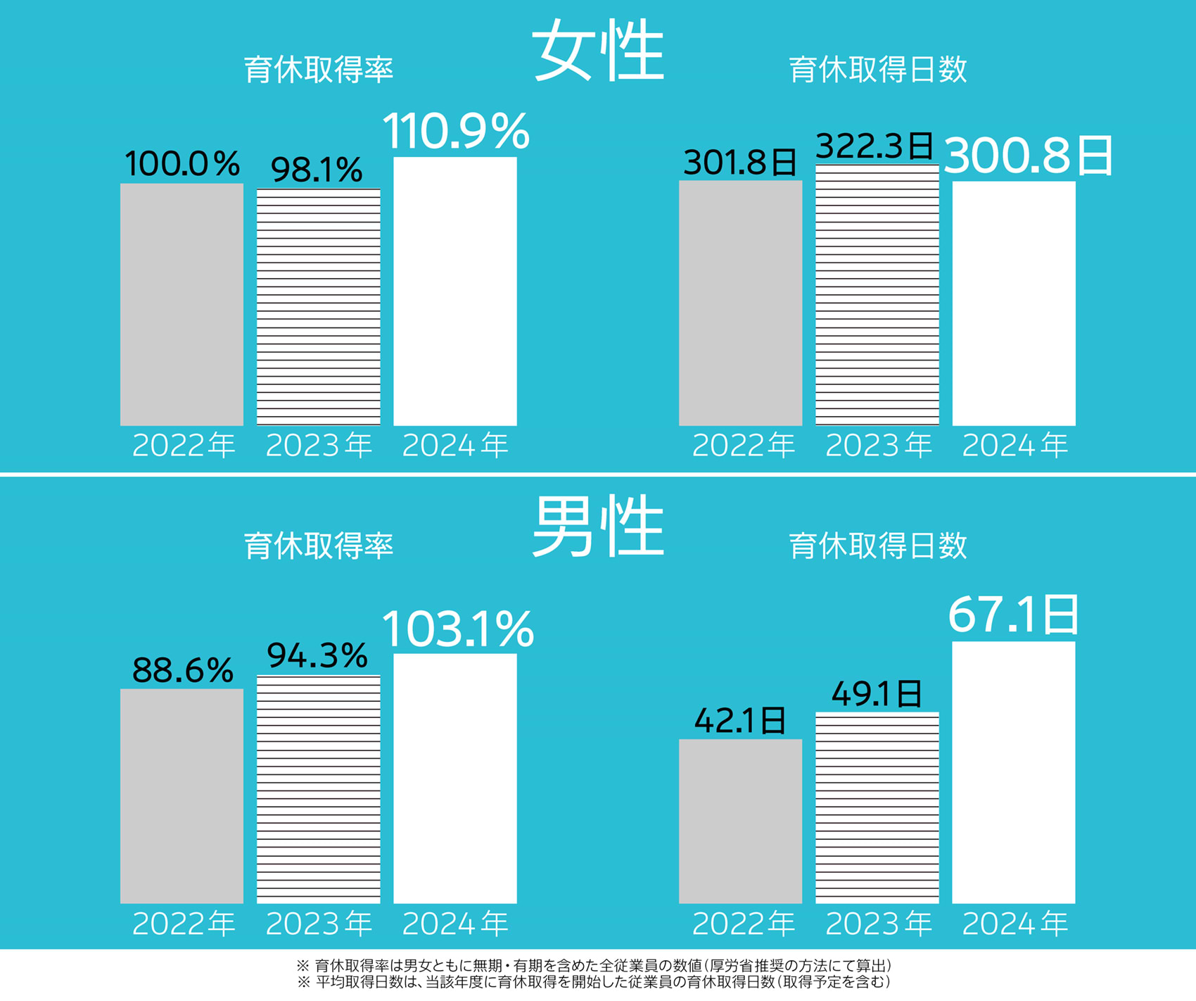 電通では、「すべての従業員が心身ともに健康に働くことができる環境づくり」や「多様な価値観、多様な働き方を通じ、従業員が自己の成長を実現できる環境づくり」が持続的な成長には欠かせないものと捉え、仕事と育児の両立を支援するため、これまでにさまざまな取り組みを実施してきました。その結果として、育児休業取得率は維持・上昇をしています。(2024年度の男性育休取得率:103.1%・女性育休取得率:110.9%)